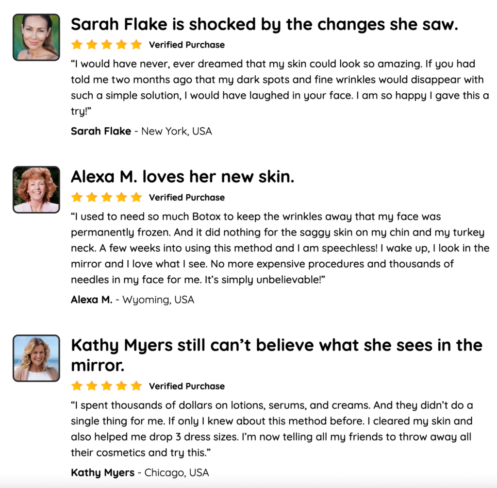 “I spent thousands of dollars on lotions, serums, and creams. And they didn’t do a single thing for me. If only I knew about this method before. I cleared my skin and also helped me drop 3 dress sizes. I’m now telling all my friends to throw away all their cosmetics and try this.”